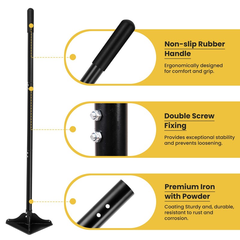 • ERGONOMIC AND ADJUSTABLE HANDLE: The handle end is equipped with a non-slip rubber sleeve, providing enhanced control, comfort and stability during use. 3-step height adjustment, you can choose a comfortable working height. ground tamper tool designed for comfort and efficiency, the adjustable steel handle allows you to choose the optimal working height, without bending over to work, reducing back pressure
