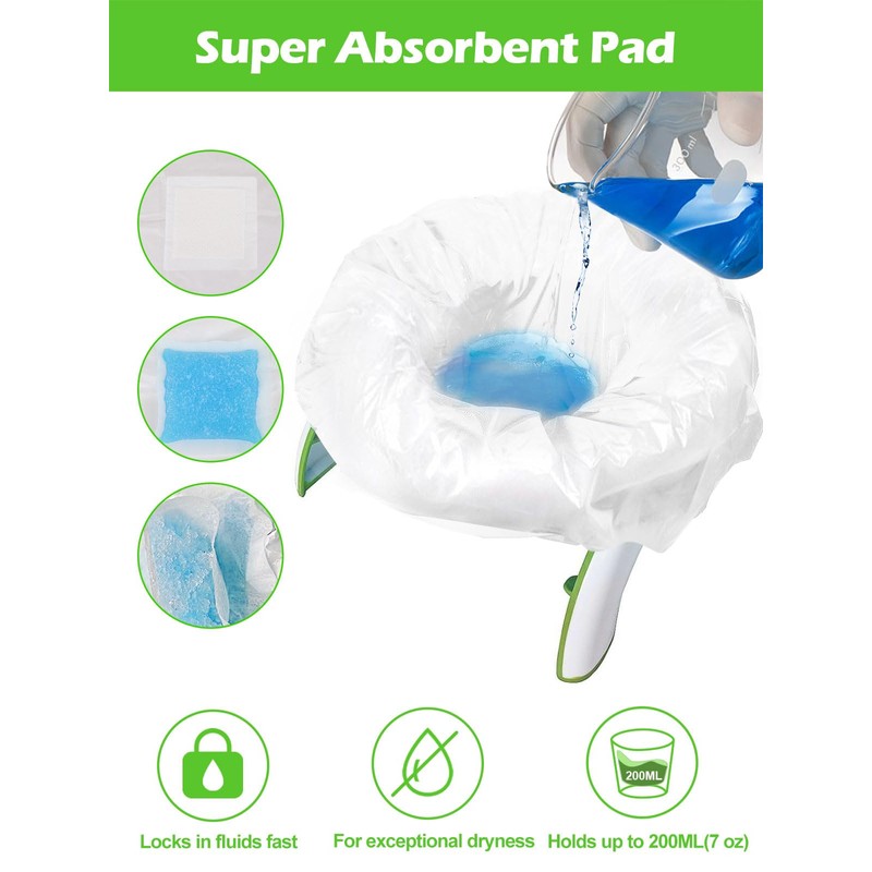 - Absorbent Pad & Leak-Proof - Our portable potty liner bag with pad absorb liquid only needs 60 seconds, reduces the odor of baby pee. And disposable potty liners can easily hold up to 7 oz of liquid. Locking in the mess for easy disposable.