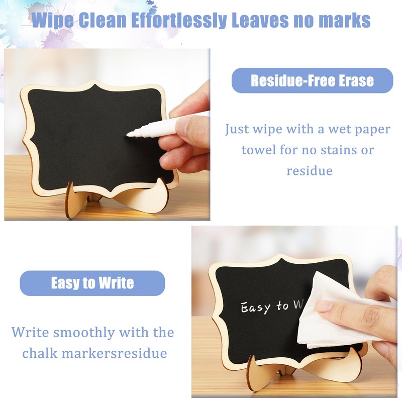 - HIGH-QUALITY MATERIALS: Our small blackboard and base are made of high-quality wood with a solid texture and are not easy to deform. It is durable and has a stable base that can stand firmly on various desktops. One set to meet the marking and decoration needs of various occasions