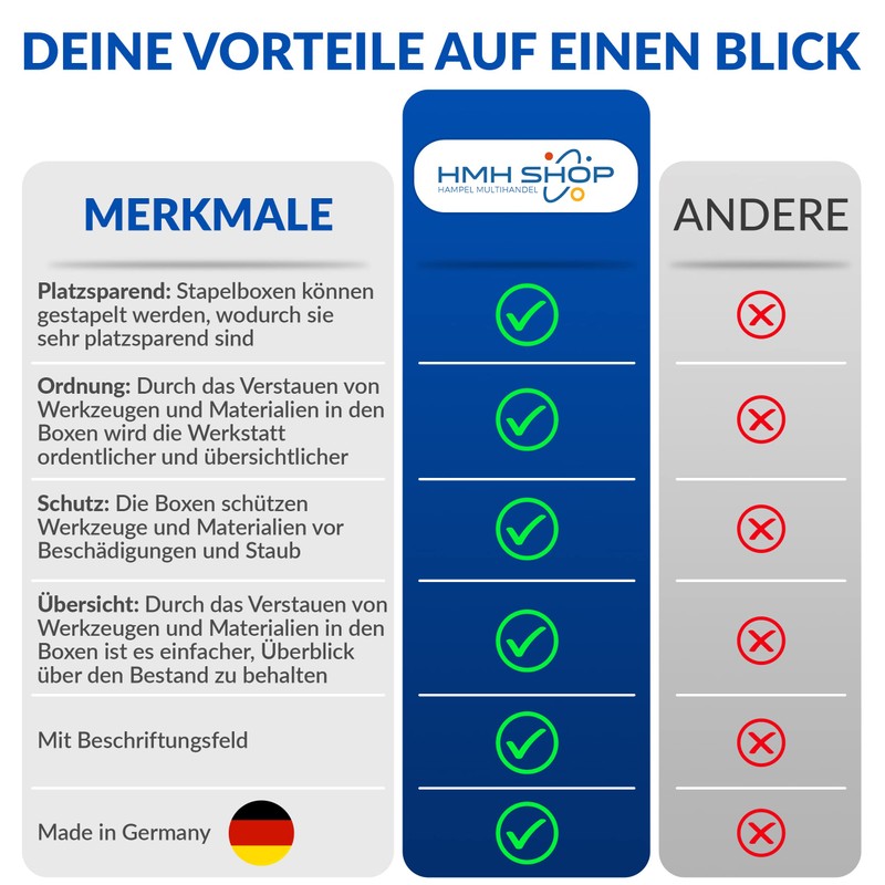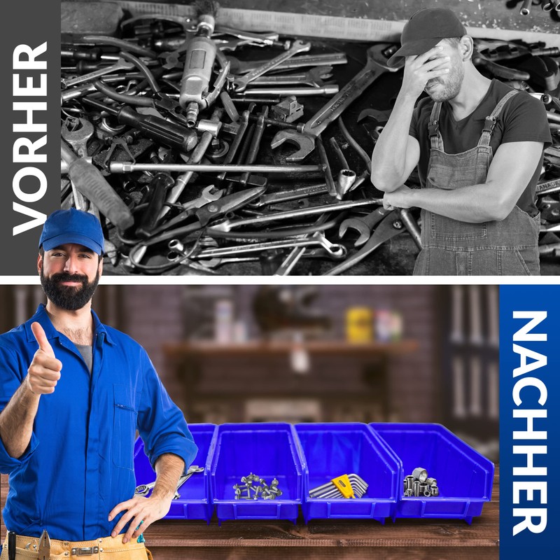 The stacking boxes were originally made for a large German range in the DIY sector in the material polystyrene. The advantage of polystyrene was that they came out almost straight during the spraying process and could also be stacked accordingly. The disadvantage of these stacking boxes made of polystyrene was the slight fragility as well as the intolerance to oil or petrol.