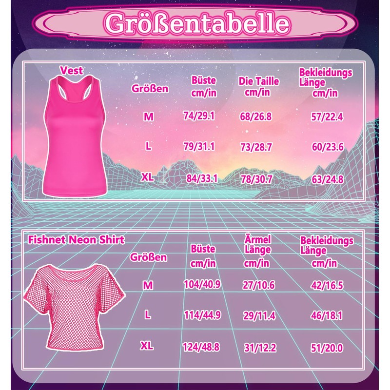 - Package includes: 1 piece tank top, 1 piece mesh shirt, 1 pair fingerless mesh gloves, 1 pair of retro neon earrings, 2 piece neon necklace, 10 piece neon silicone bracelets, 1 piece leg warmer; 1 piece lace headband; 1 bum bag; 1 x glasses; complete your requirements for 80s neon party costume accessories.