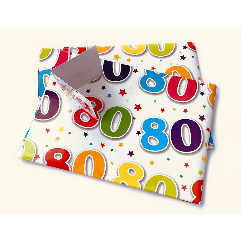 80th Birthday Wrapping Paper- 2 Sheets Gift Wrap and 1 Matching Tag. Made in UK