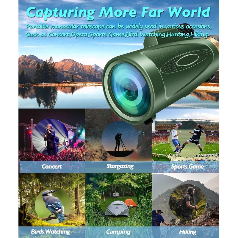 - Excellent Gift: This monocular is excellent gift for Father's Day, Christmas, Birthdays and more. It is suitable for a variety of outdoor sports: hunting, observing animals, mountaineering, camping, travel, hiking, water sports, ball games, watching scenery, monitoring, outdoor exploration and other activities.