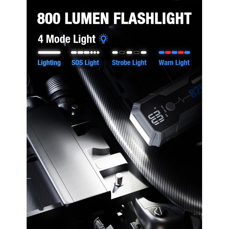 • 【800 LUMEN EMERGENCY LIGHTS】The jump starter battery pack is featured with updated 800 lumen LED lights, larger luminous area and 300°wide-angle irradiation, significantly providing 400%+ brightness. 4 modes lights are for different emergency and double as warning triangle. Outperform countparts and bring you sense of safety.