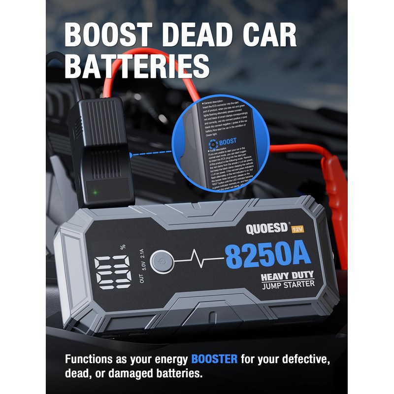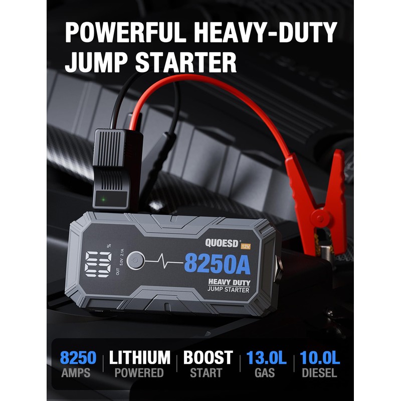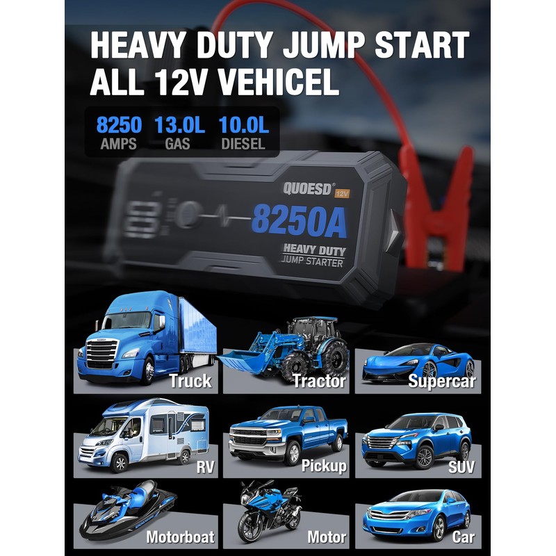• 【Portable Heavy Duty Jump Starter】Built for the most powerful engine starts. With over 8250 amps of power, This jump starter can handle 13.0L gas and 10.0 diesel engines. The car battery jump starter works on all engine—Class 8 trucks, RVs, buses, construction equipment, farm machinery, and even 6, 8, 12, or 16-cylinder engines.