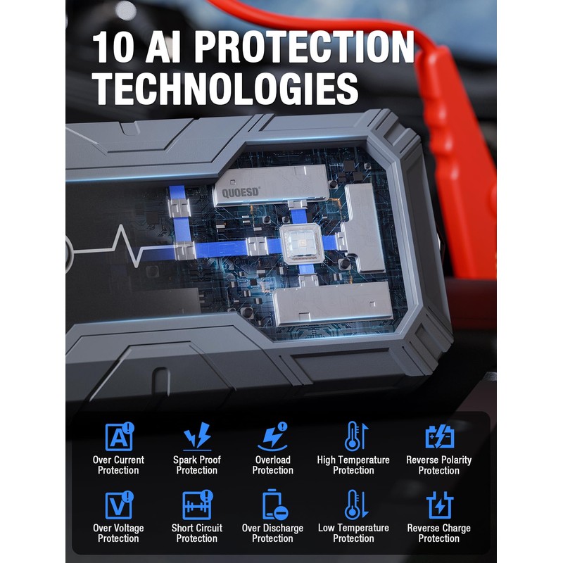 • 【Advanced Ultra-Safety Technology】 QUOESD jump starter battery pack have 10 protection systems. Safely connect to all 12-volt battery with our mistake-proof design featuring spark-proof technology and reverse polarity protection. Safe and easy to use battery jump starter pack without the worry of incorrect connections or sparks. It is dustproof and 1.5m drop-proof. It can work at extreme low temperature of -40°F . You don't have to worry about not being able to use it in winter. The jump starter battery pack has 48 Months Stand-by Time.