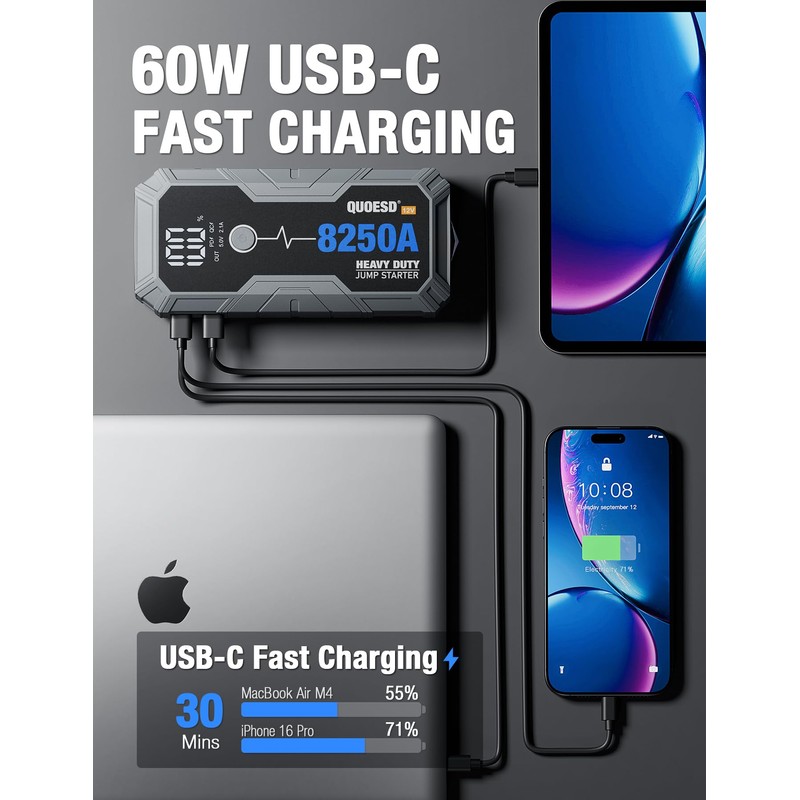 • 【60W Chargeable】The 8250A Car battery jump starter is equipped with two-way 60w USB-C charging technology that, combined with power delivery, gives you lightning-fast recharges. Go from 0% to jump starting in just 5-minutes of charge. You can also charge this jump starter battery pack through the type-c port using your own 60w fast charge wall charger.
