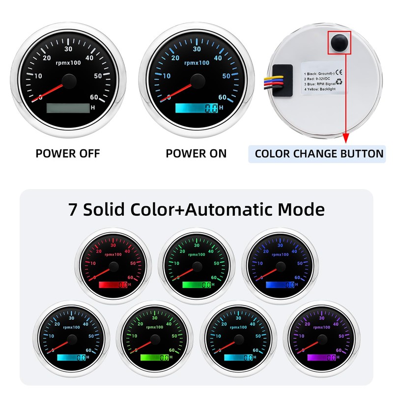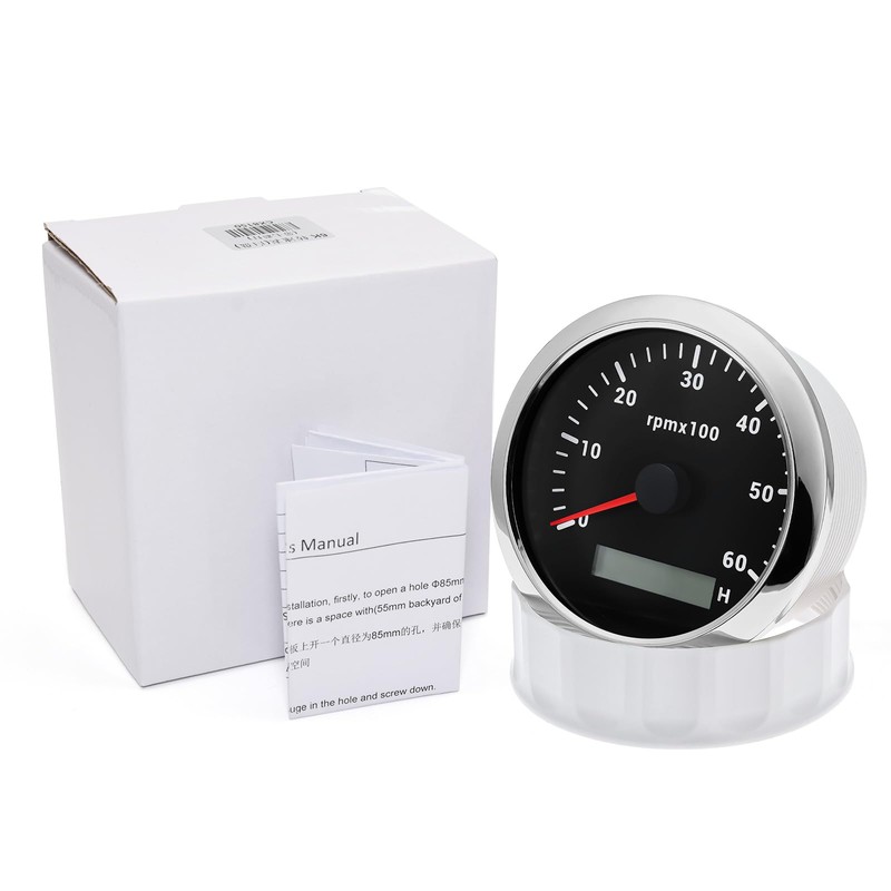 - Material: 85 mm 3/8 inch (52 mm) black face tachometer made of 316 stainless steel bezel with curved glass. Prevent fog on the glass surface, so you can easily see the instrument display. Red illuminated needle, bright LED indicator during the night