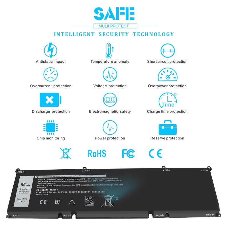 - SECURITY : Emanjor 86Wh 69KF2 Laptop batteries have passed strict intelligent detection, such as short circuit protection, over voltage protection, discharge protection, over current protection, which is very important for battery’ s use cycle and safety. All batteries are equipped with high quality material to ensure good performance. CE, FCC, RoHS certificated.