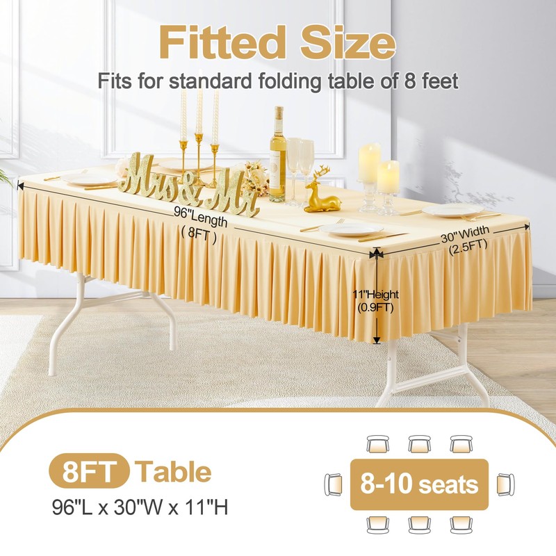 - 【Stretch Fitted Tablecloths for 8 Foot Tables】Our champagne tablecloth size is 96" L x 30" W x 11" H, fit for 8 ft rectangle tables well and never slip off. These champagne spandex table covers are easy to put on and take off without ripping.