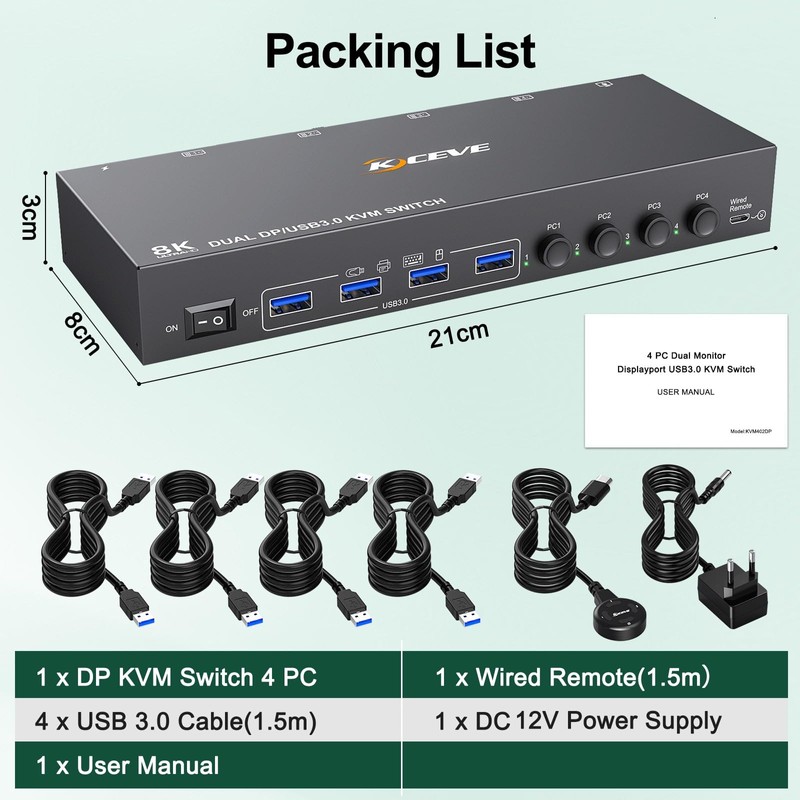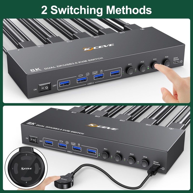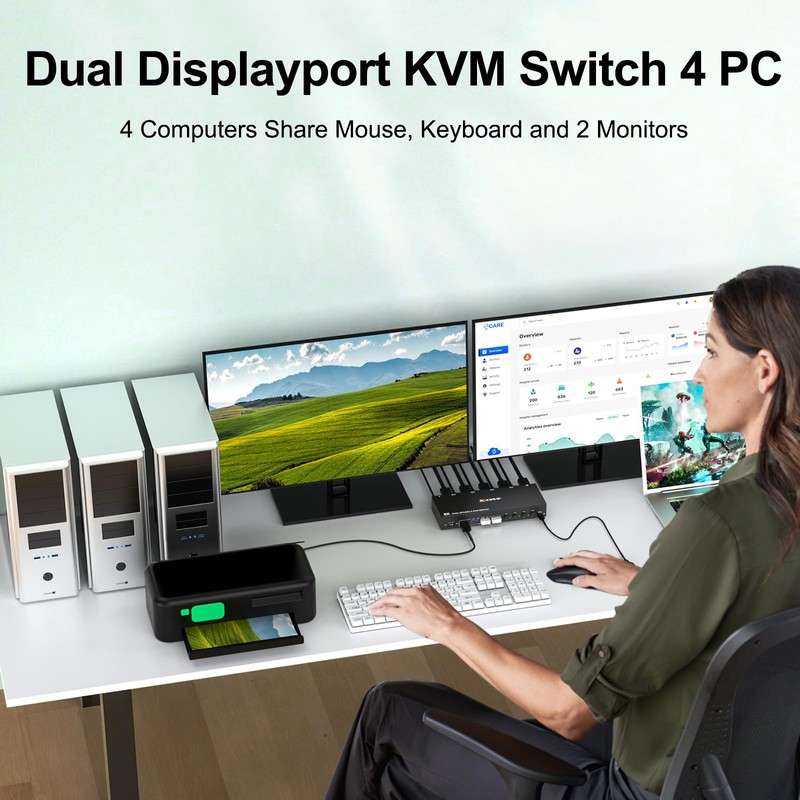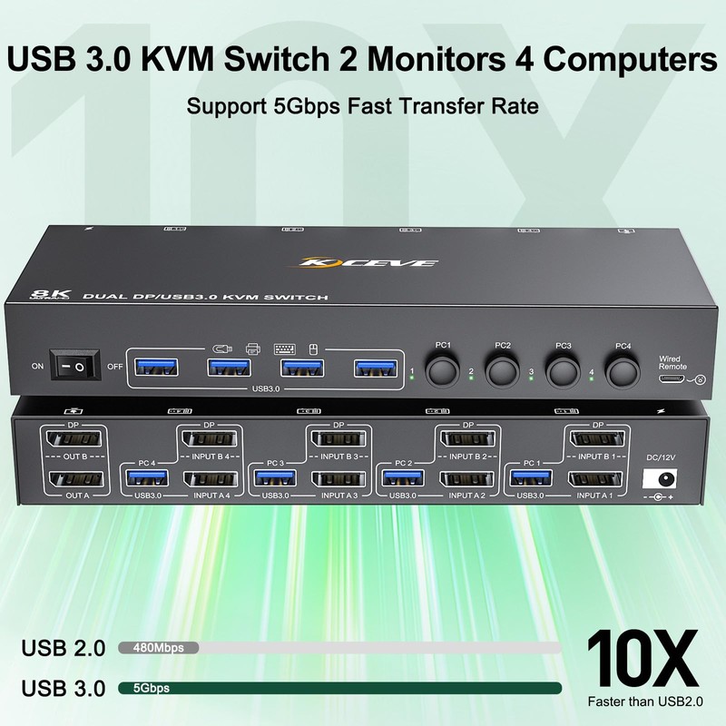 - 【Dual Displayport KVM Switches with 4 USB 3.0 Ports】Dual monitor DP USB switch with 4 integrated USB 3.0 ports, supports ultra-fast USB 3.0 data transfer speeds up to 5Gbps, effortlessly transfer data, images, and files between your connected devices. Experience blazing-fast data transfer speeds for enhanced productivity. which can recognize keyboard,mouse,printer, scaner, etc.If you want to improve office efficiency, it will be your best choice