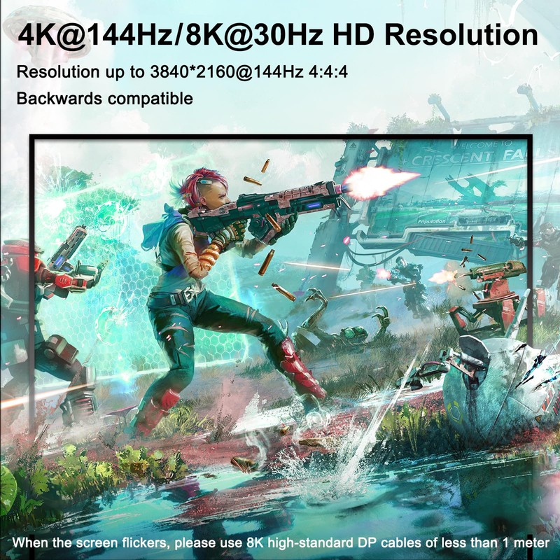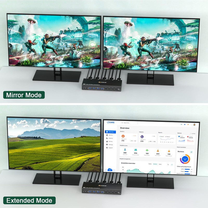- 【KVM Switch 2 Monitors Ultra HD 8K@30Hz】Dual monitor KVM Switch displayport support resolution 4K@144Hz 8K@30Hz. this 2 monitors KVM aslo support input terminal to connect 4 computers with different resolutions, e.g. one is 4K@60Hz, the other is 4K@30Hz, 1440P@60Hz. You need to use extended mode to achieve different resolutions Note: Final resolution is also subject to graphic cards, monitors, cables and adapters.