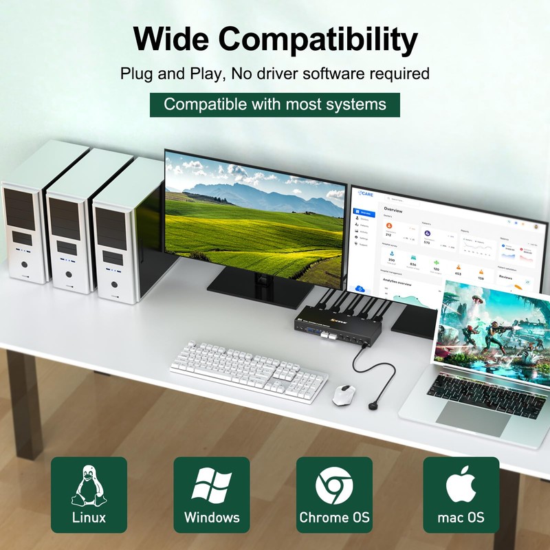 - 【KVM Switch 2 Monitors 4 Computers】This KVM switch dual monitor help you to control 4 computers or laptops by only one set of wired or wireless keyboard mouse,share 2 monitors and 4 USB 3.0 devices【Only support displayport Computers】