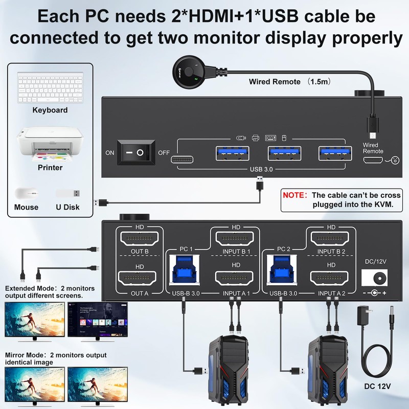 - 【HDMI2.1 KVM Switch Dual monitor】This 2 monitors KVM switch allows you to effortlessly manage 2 computers to share 2 monitors and 4 USB devices together. You can choose expanded mode and copy mode between two monitors as required.The extended mode can output two different screens and the Mirror mode can output two identical screens.
