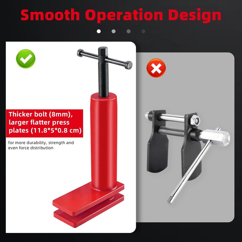 • 【Smooth Operation Design】Our Brake Caliper Piston Compression Tool has a thicker bolt (8mm), and has a larger, flatter press plates (11.8 × 5 × 0.8 cm) for more durability , strength and even force distribution