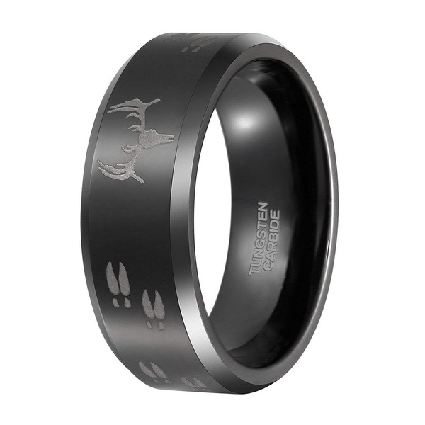 8mm Black Etched Deer Head Tungsten Carbide Wedding Band Men's Hunting Ring Size 8.5