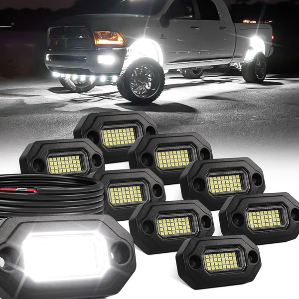 8pcs Pure White LED Rock Lights for Trucks Jeep UTV ATV SUV Trailers with 15FT Leads Each Light