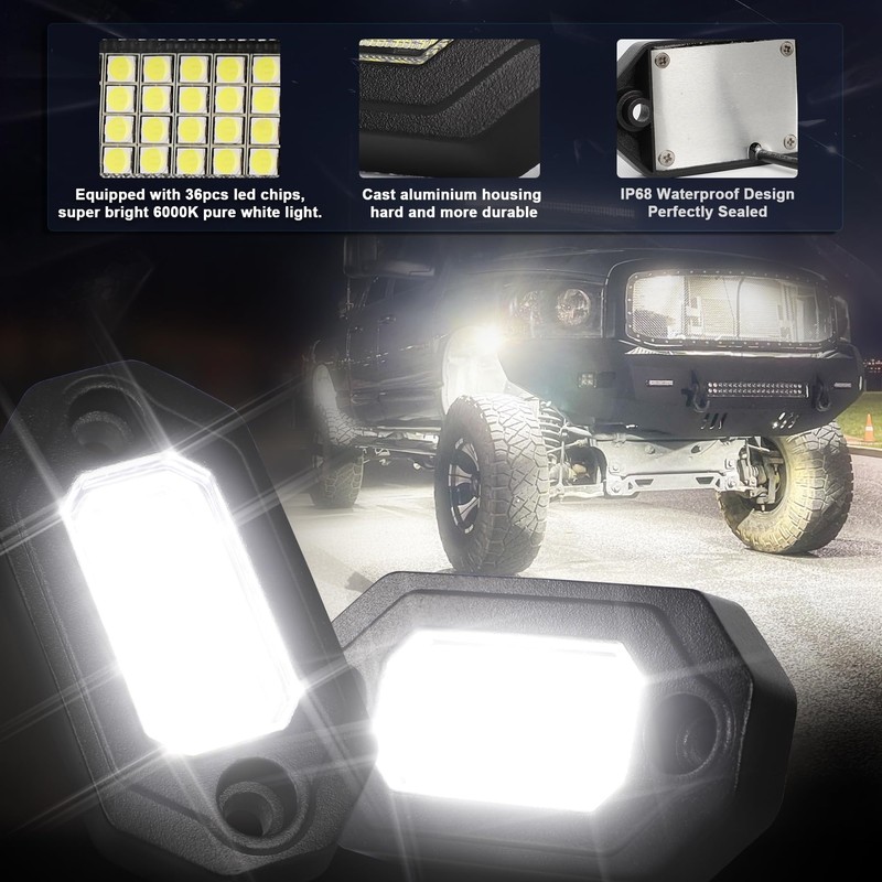 36LEDs, 6000k pure white rock lights light up the undercarriage of any truck, Jeep, or all-terrain vehicle,