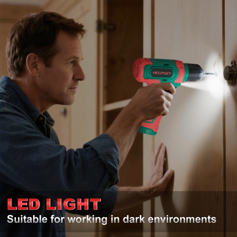 - Trigger-Activated Built-In LED Light: Precise Operation in Low-Light Environments. The LED light turns on instantly when the trigger is pressed, illuminating dark or tight spaces like under cabinets, inside closets, and behind appliances. Even in low-light conditions, it ensures precision for drilling and screwdriving, avoiding mistakes.