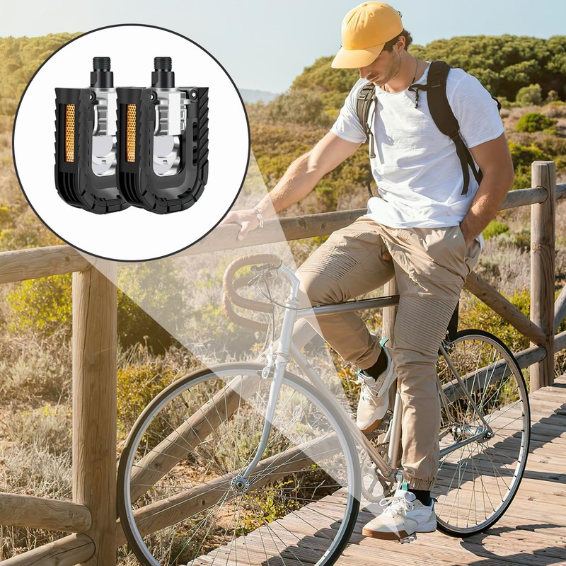 Upgrade your biking experience with 9/16" Bicycle Pedal Set, designed for both performance and durability. These pedals are made from high-strength aluminum alloy, providing a lightweight yet strong construction that can handle the demands of road biking, mountain biking, BMX, and more. The durable aluminum alloy material offers exceptional load-bearing capacity, ensuring that the pedals can withstand heavy use while maintaining their shape and functionality over time. The lightweight design also enhances anti-vibration performance, making your rides smoother and more comfortable.