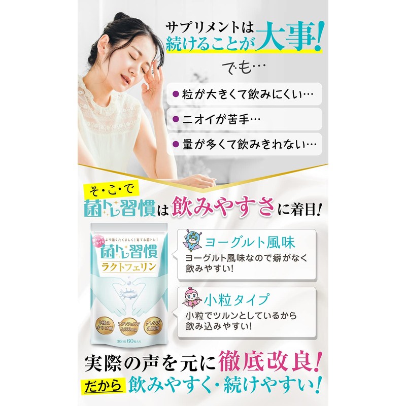 - 菌トレ習慣シリーズでも希少成分ラクトフェリンを高配合したラクトフェリンに特化したサプリメント。