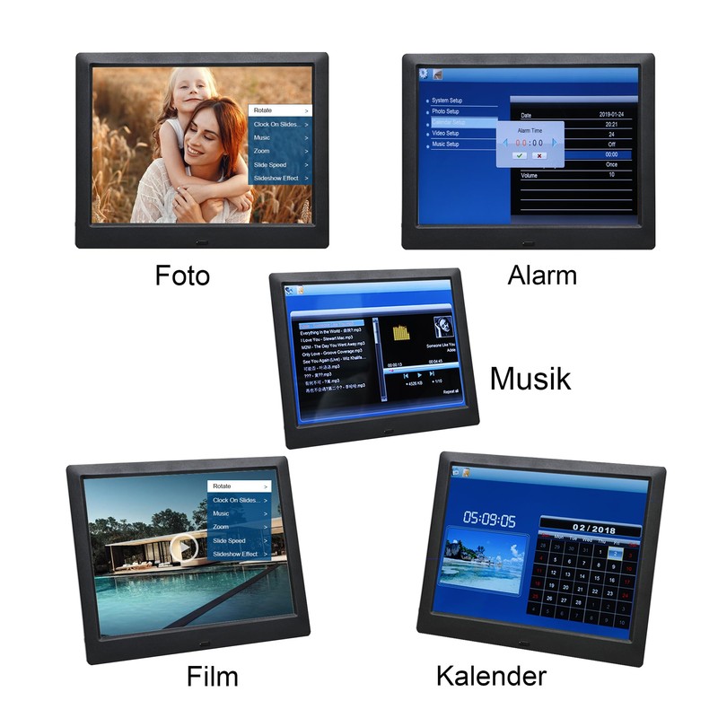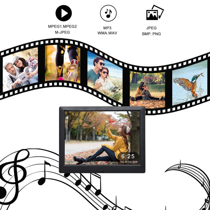 - Multi-functions: electronic picture frames support music / photo / video / calendar / clock / alarm / 6 languages, a great gift for friends and family. Thanks to the practical automatic on/off function, it is more than a photo frame