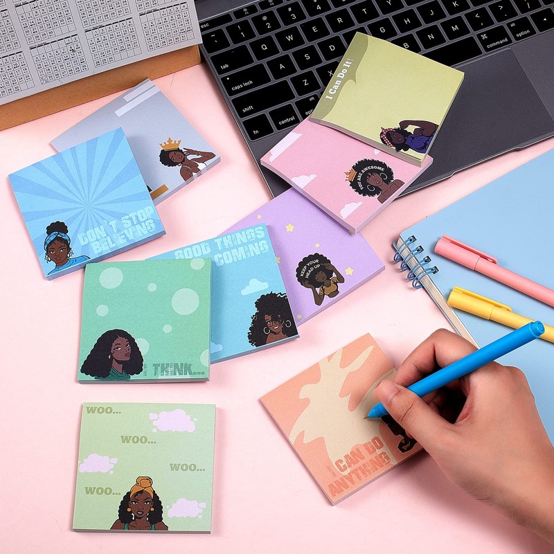 - Inspirational Theme with Black Girl Patterns: these cute sticky notes adopt the inspirational theme, printed with different black girls and positive affirmation quotes, look elegant and appealing, reminding girls to be optimistic and confident in their lives