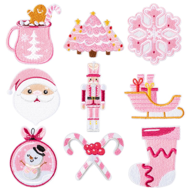 - Festive Xmas Designs: This set includes 9 pink patches featuring festive motifs such as a Nutcracker, Santa Claus, Christmas Tree, Christmas Stockings, Snowman, Snowflake, Hot Cocoa, Candy Canes, and Sleigh.