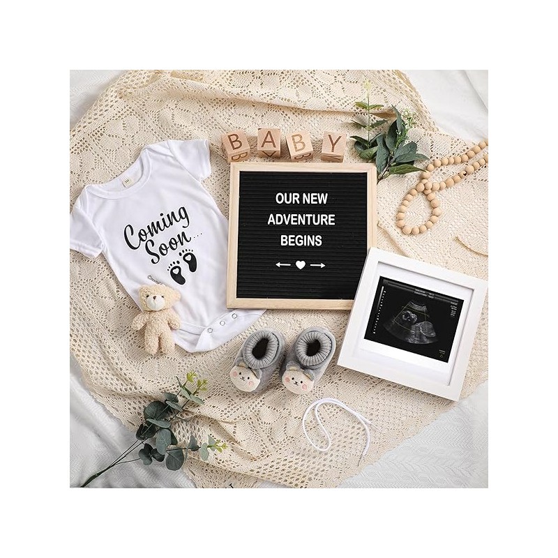 9 Pcs Pregnancy Announcement Set Pregnancy Reveal Ideas Felt Letter Board Baby Bodysuit Booties Photo Frame Bear Plush Wood Blocks for Coming Soon Baby Announcement(Black)