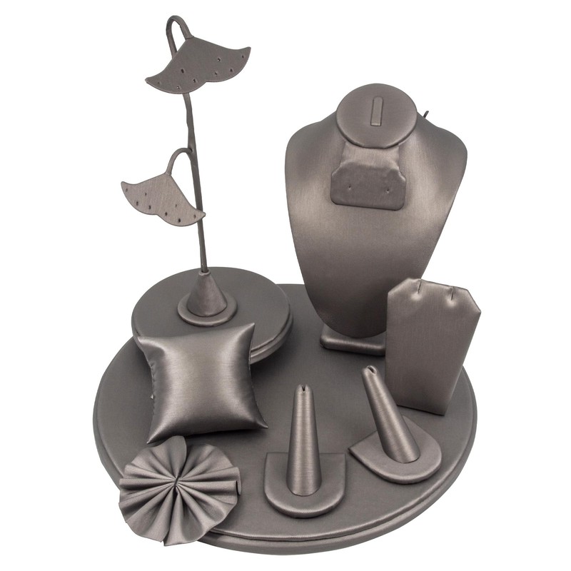 9 Piece Jewelry Display Set for Necklaces, Earrings, Rings, Bracelets, and watches. Perfect for businesses. (Steel Grey Faux Leather)