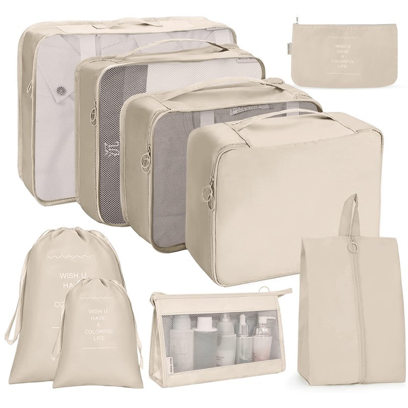 9 Set Beige Packing Cubes Travel Luggage Organizer Packing Bags for Carry on Suitcases