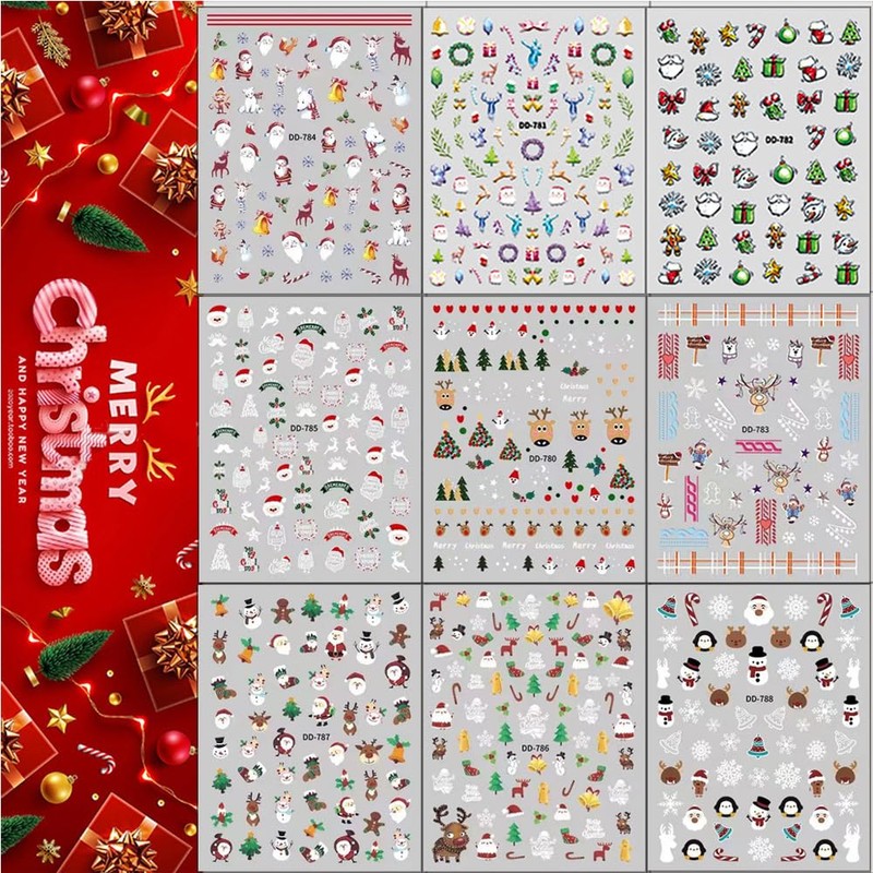 9 Sheets Christmas Nail Art Stickers 3D Winter Xmas Nail Decals Cartoon Elk Snowflake Santa Claus Snowman Christmas Tree Reindeer Designs Nail Sticker Supplies Christmas Nail Art Decoration