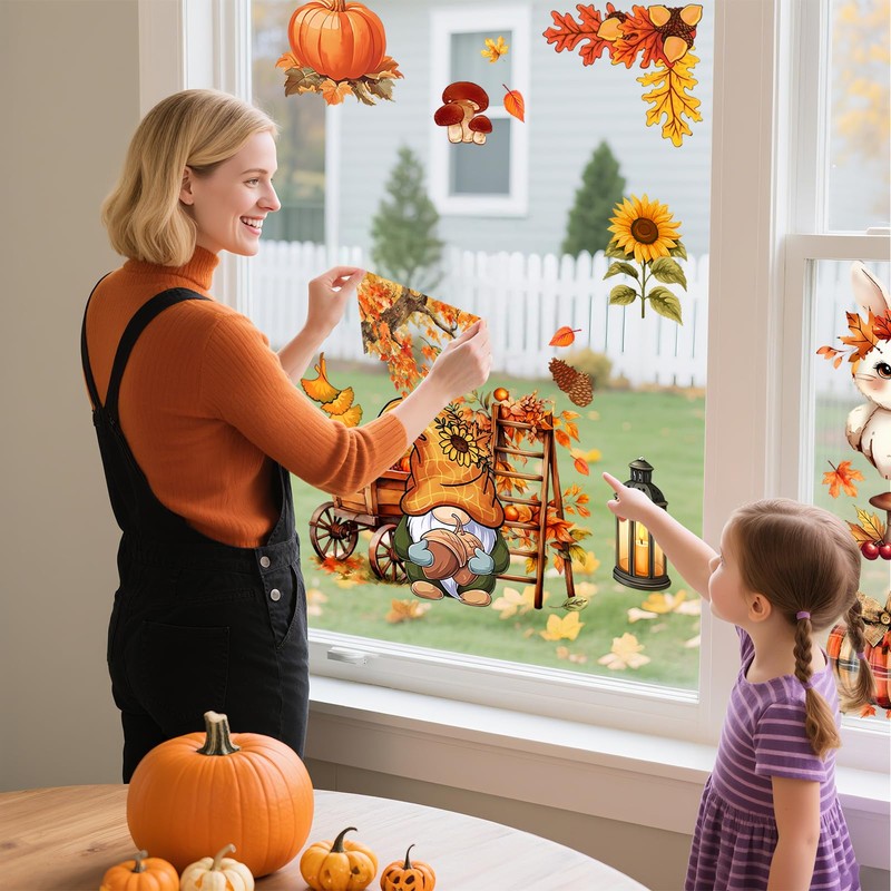 Bring the cozy charm of autumn to your home with these vibrant fall-themed window clings! This set includes 9 large sheets (11.8" x 7.87") featuring classic pumpkins, maple leaves, foxes, rabbits, dogs in hats, gnomes, and cats—perfect for instantly transforming windows, glass doors, mirrors, and even car windows into festive seasonal displays.