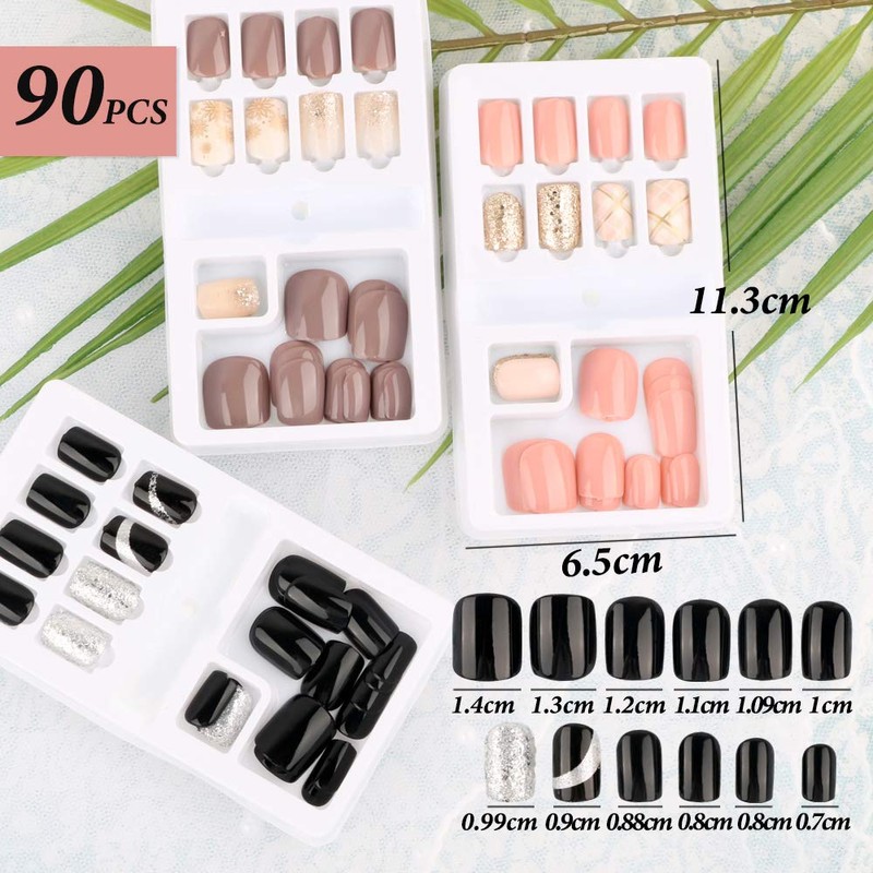 - Package: 90 pieces of short square false nails + 3 x wood nail pusher + 3 x short nail file + 3 x nail cleaner wrap + 3 sheets nail jelly glue