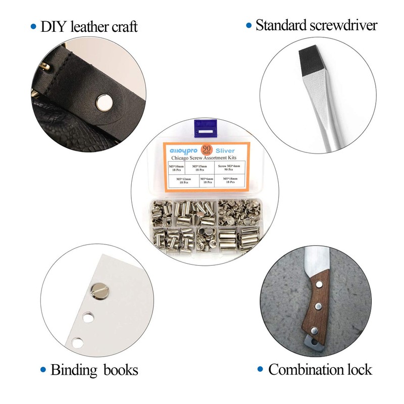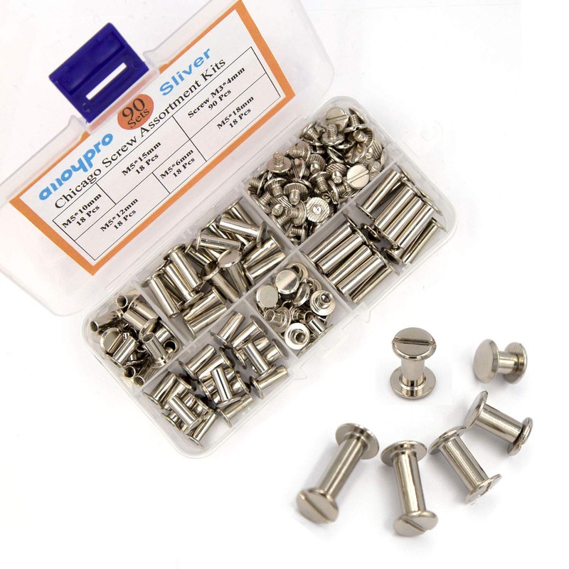 • 90 sets of 5 sizes:The chicago rivets set kit include 5 sizes,The chicago rivets set kit include 5 sizes(M5*6mm,M5*10mm,M5*12mm,M5*15mm,M5*18mm). 18 sets for each size, the diameter of these screw rivtes are all 5mm(3/16 inch). 5 kind of post length are 6mm(1/4 inch),10mm(3/8 inch),12mm(1/2 inch),15mm(5/8 inch),18mm(11/16 inch).Various lengths are available to meet your different needs.