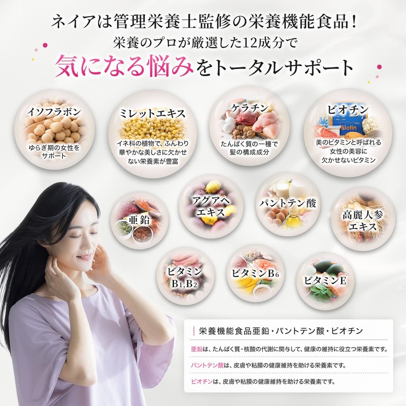 • ✅【ネイアは栄養機能食品です】  ネイアは亜鉛、パントテン酸、ビオチンの基準を満たした栄養機能食品です!