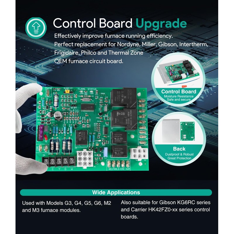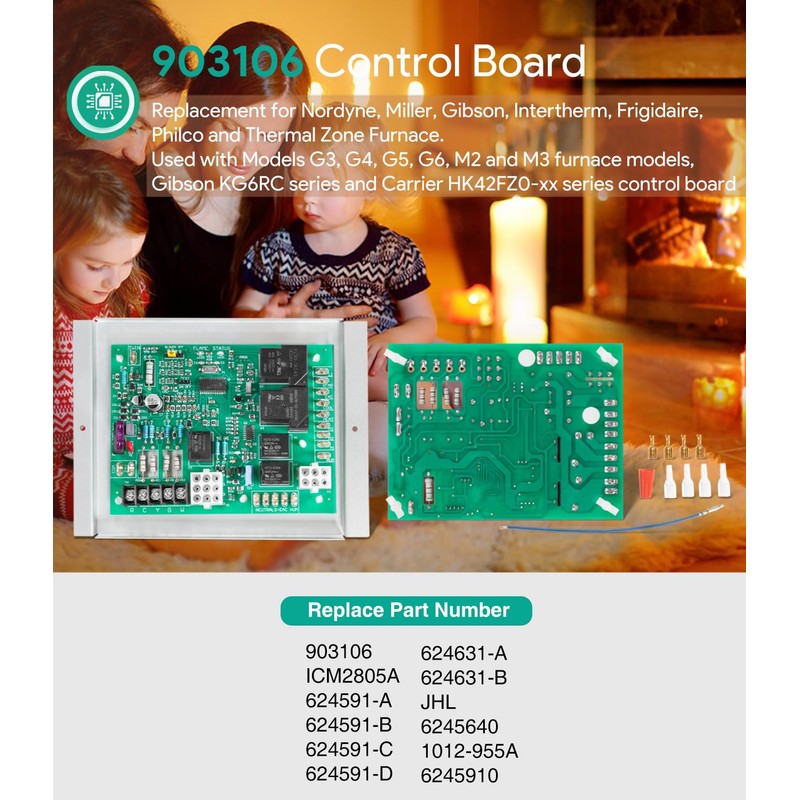 • 【Great Compatibility】 903106 Furnace Control Board is Perfect Replacement for Nordyne: 903106. Replacement for Nordyne, Miller, Gibson, Intertherm, Frigidaire, Philco and Thermal Zone Furnace. Used with Models G3, G4, G5, G6, M2 and M3 furnace modules and Gibson KG6RC series. Also compatible with Carrier HK42FZ0-xx series control boards. Replace Part # 903106, ICM2805A, 624631, 624591-A, 624591-B, 624591-C, 624591-D, 624631-A, 624631-B, JHL, 6245640, 624631-A, 1012-955A and 6245910.