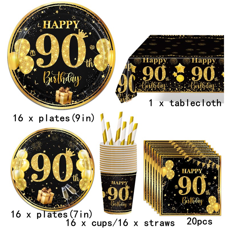 - 90th Birthday Tableware: 90th Birthday Tableware set total 85pcs,16 90th Birthday dinner plates 9 inch,16 90th Birthday dessert plates 7 inch,16 cups,20 napkins,16 gold straws,1 tablecloth 54 inch 108 inch,serves 16 guests