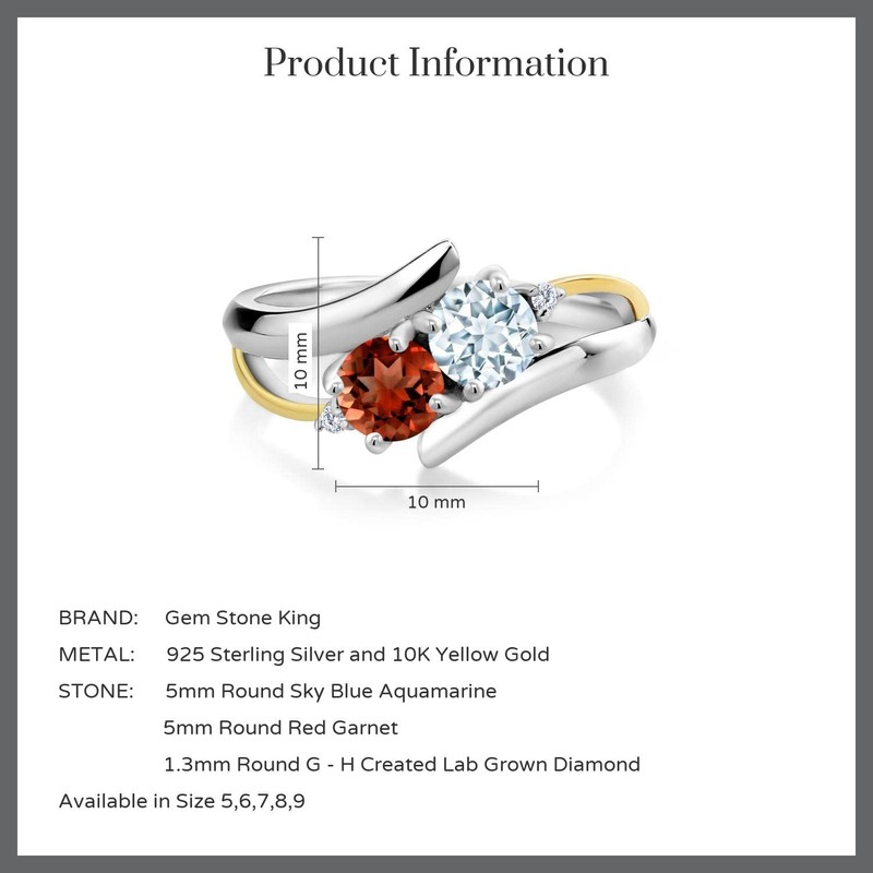 - Elegant Harmony: Elevate your style with the exquisite fusion of 925 sterling silver and 10K yellow gold. The Gem Stone King 2 Stone Crossover Ring features a stunning combination of sky blue aquamarine and deep red garnet, beautifully accented by white lab grown diamonds.