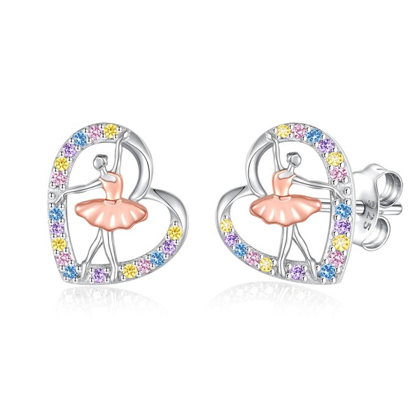 925 Sterling Silver Ballet Dance Earrings Ballerina Heart Stud Jewelry Gifts for Women Dancer, S925, Cubic Zirconia