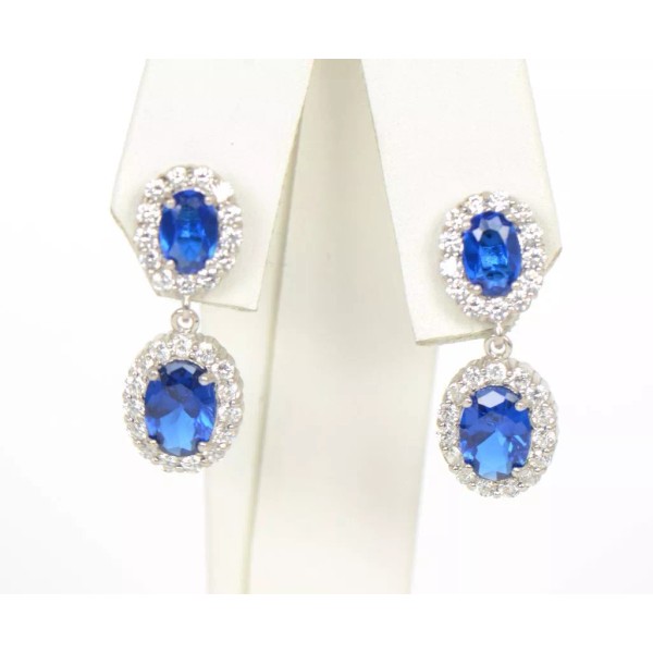 This is .925 Sterling Silver Dangle Stud Earrings. The earrings are dangle studs with push backs. The length is 22mm and the width is 8.6mm. The earrings have 2 Sapphire (Lab Spinel) stones. The Bigger is oval shape and measures 7x5mm and the smaller is 6x4mm. Around Stones earrings are crafted with small 1.5mm Cubic Zirconia stones.