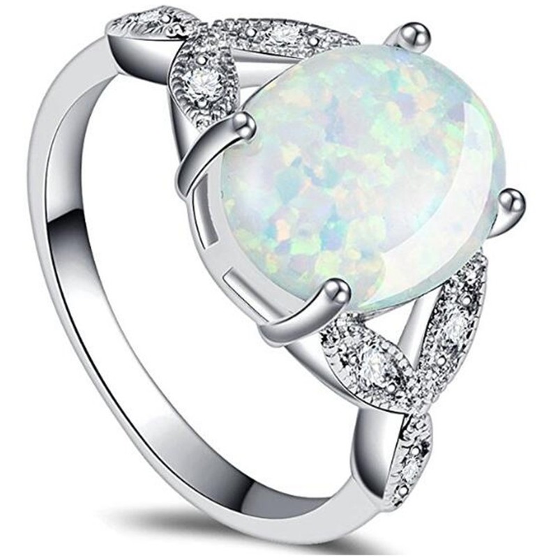 925 Sterling Silver Oval Shaped Created Fire Opal Wedding Engagement Promise Anniversary Ring (Silver White, T)