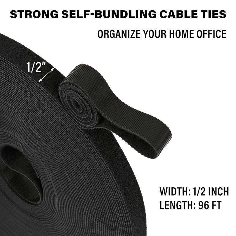 96 ft x 1/2 inch Hook and Loop Roll, Reusable Fastening Cable Ties, Multi-Purpose Cable Management Wire Ties Cable Straps for Organizing Home, Office and Data Centers