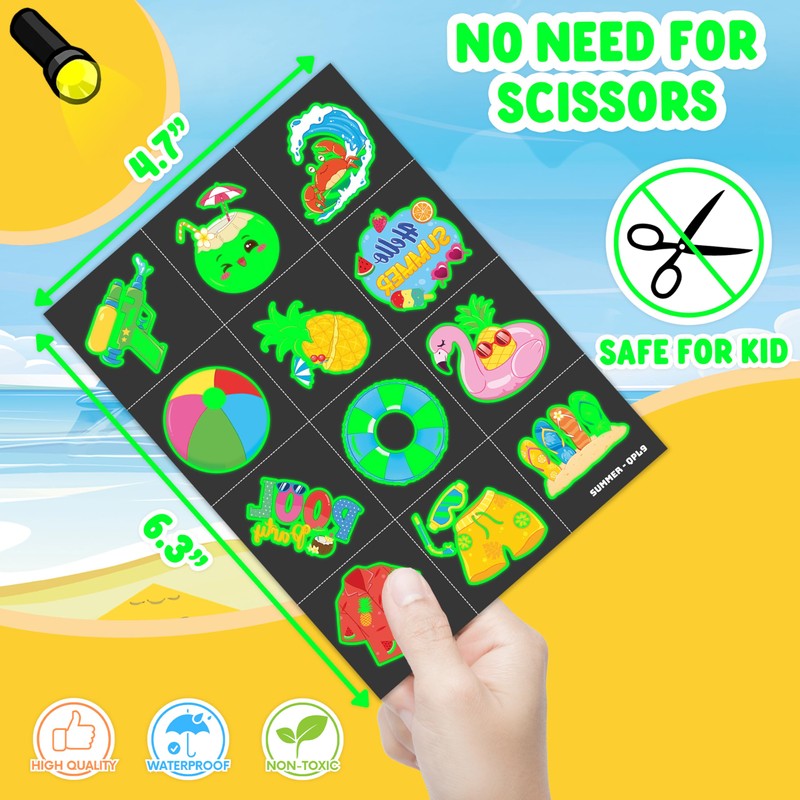 96 PCS Hello Summer Beach Pool Hawaiian Pre-Cut Temporary Tattoos for Kids | Super Cute Themed Birthday Party Favors, Supplies, Decorations, Fake Tattoo Stickers (Luminous)