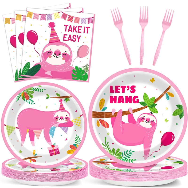 - 【Fun and Cute Design】This sloth themed paper plate is all designed with hanging sloth graphics. Decorating your birthday party with these sloth dinnerware sets can bring the birthday atmosphere to your party. Impress your guests with our cute and fun sloth dinnerware that's sure to wow them.