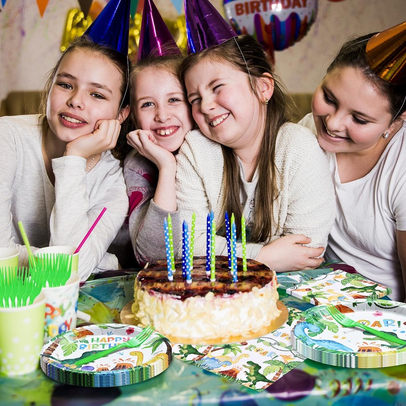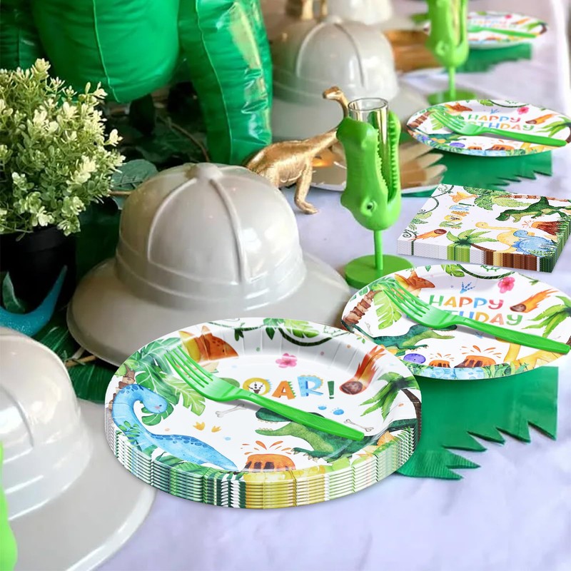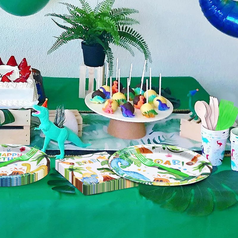 - High-Quality Tableware Set - This Dinosaur Birthday tableware set includes everything you need for a fun and exciting celebration. Made from premium-quality paper, the plates and napkins are sturdy enough to hold all your favorite party foods while remaining soft and comfortable for use.