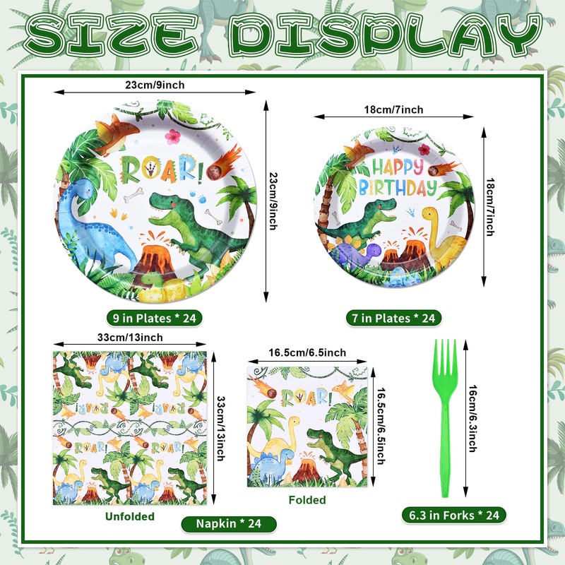 The set includes 24 nine-inch plates for main courses, 24 seven-inch plates for desserts or snacks, 24 napkins, and 24 forks, making it a complete solution for your dinosaur-themed celebration. The vibrant dino designs feature friendly dinosaurs, lush greenery, and a playful “Happy Birthday” message, adding a fun and festive touch to your party décor.
