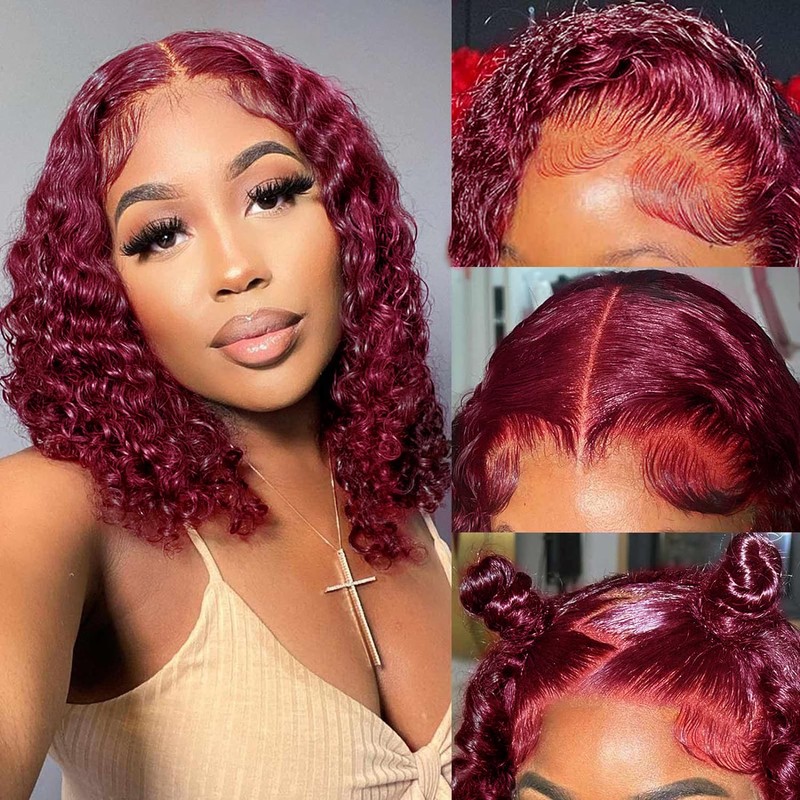 - Qualität: 150 % natürliche Dichte, 99J Burgunderrot, gelockt, Bob Frontal Perücken ist weich, nicht zu voll oder dünn. Der nicht erkennbare, makellose Mittelscheitel-Haaransatz kann frei sein. Minimaler Haarausfall und Verheddern. Kann gefärbt und geglättet werden