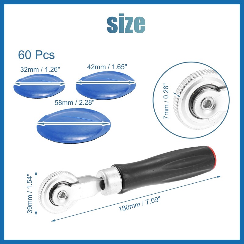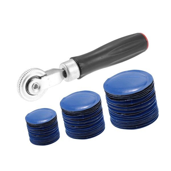 - Convenient: Package Include: 1 x Tire Patch Roller, 20 x 32mm Tire Repair Patches, 20 x 42mm Tire Repair Patches, 20 x 58mm Tire Repair Patches. Size: Tire Patch Roller Size: 180x39mm / 7.09"x1.54"(H*D), Tire Patches Diameter: 32mm / 1.26", 42mm / 1.65", 58mm / 2.28"
