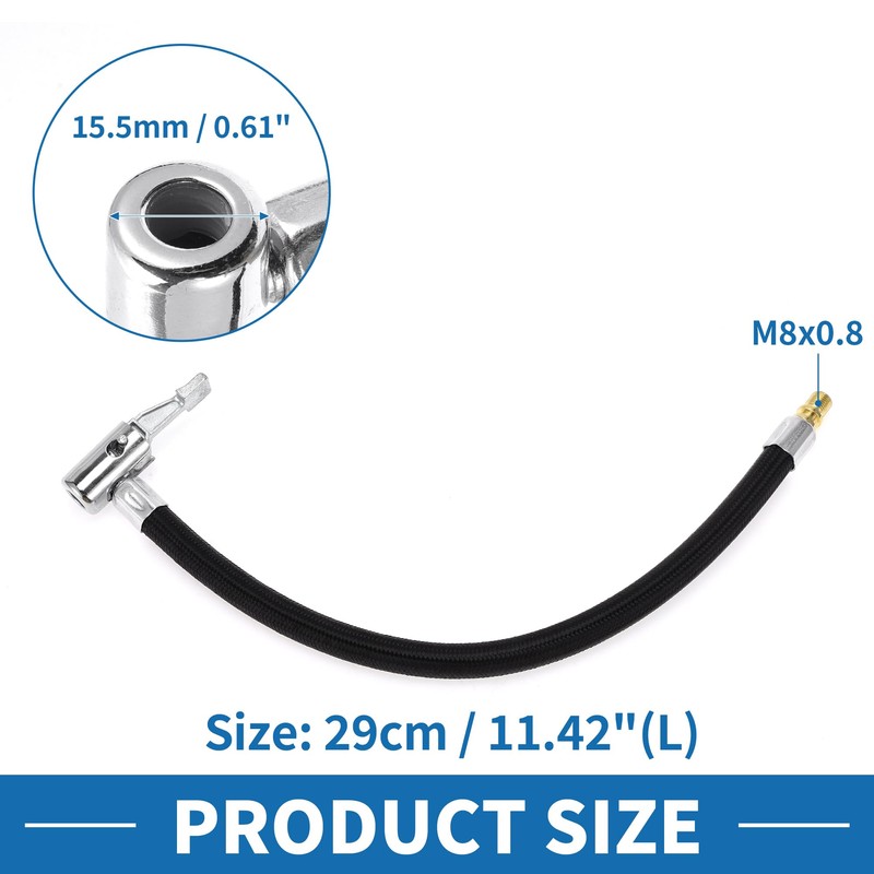 - Details:Color: Black, Gold Tone, Material: Nylon, Metal, Size: 29cm / 11.42"(L), Connector Thread Size: M8x0.8, Air Chuck Outer Diameter: 15.5mm / 0.61", Type of Tire Connection: Quick Connect, Type of Inflator Adapter: 0.305inx32TPI